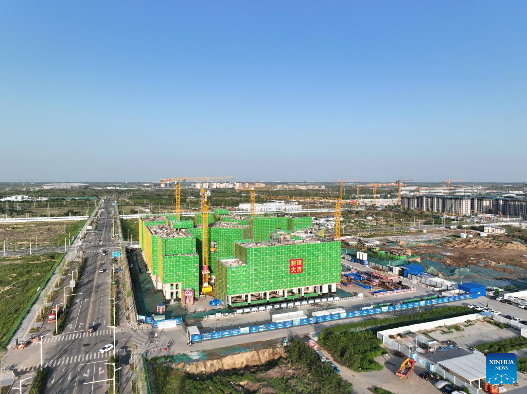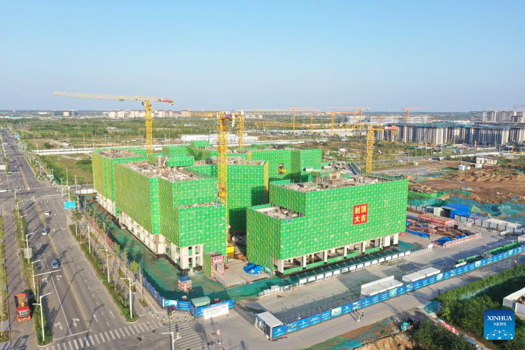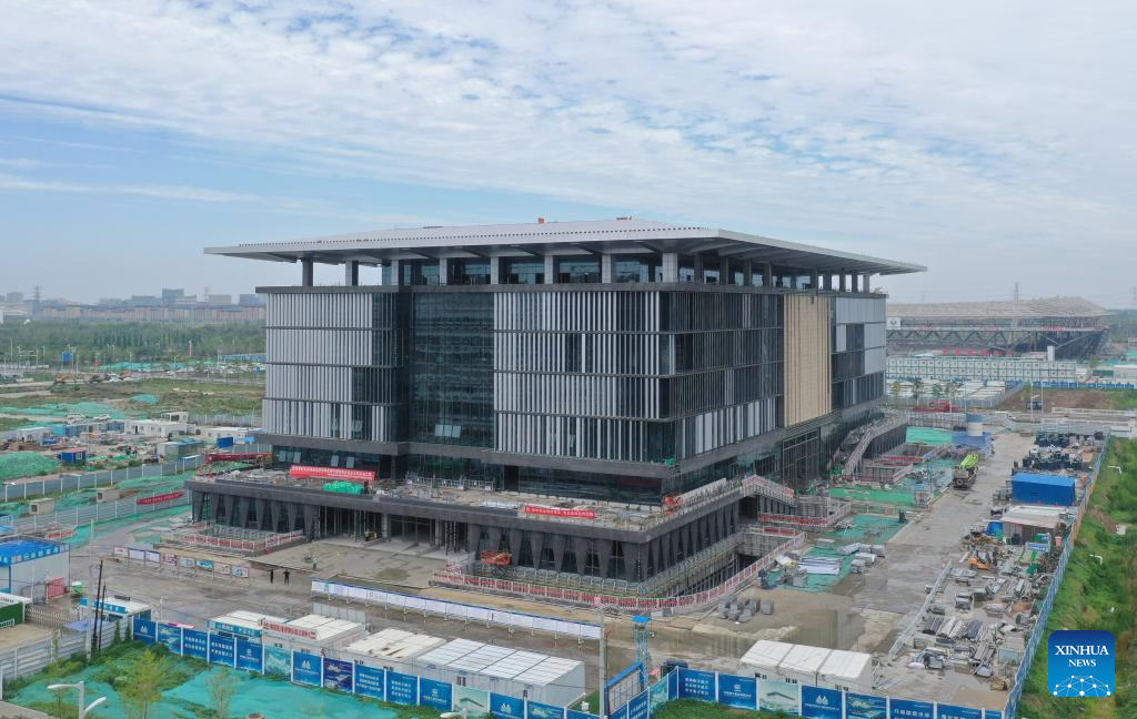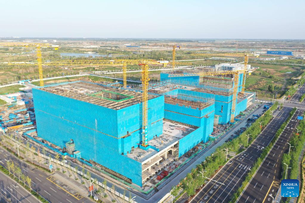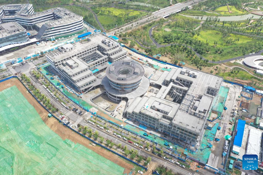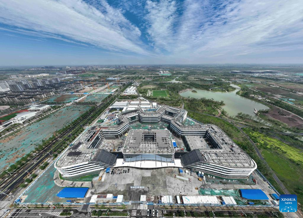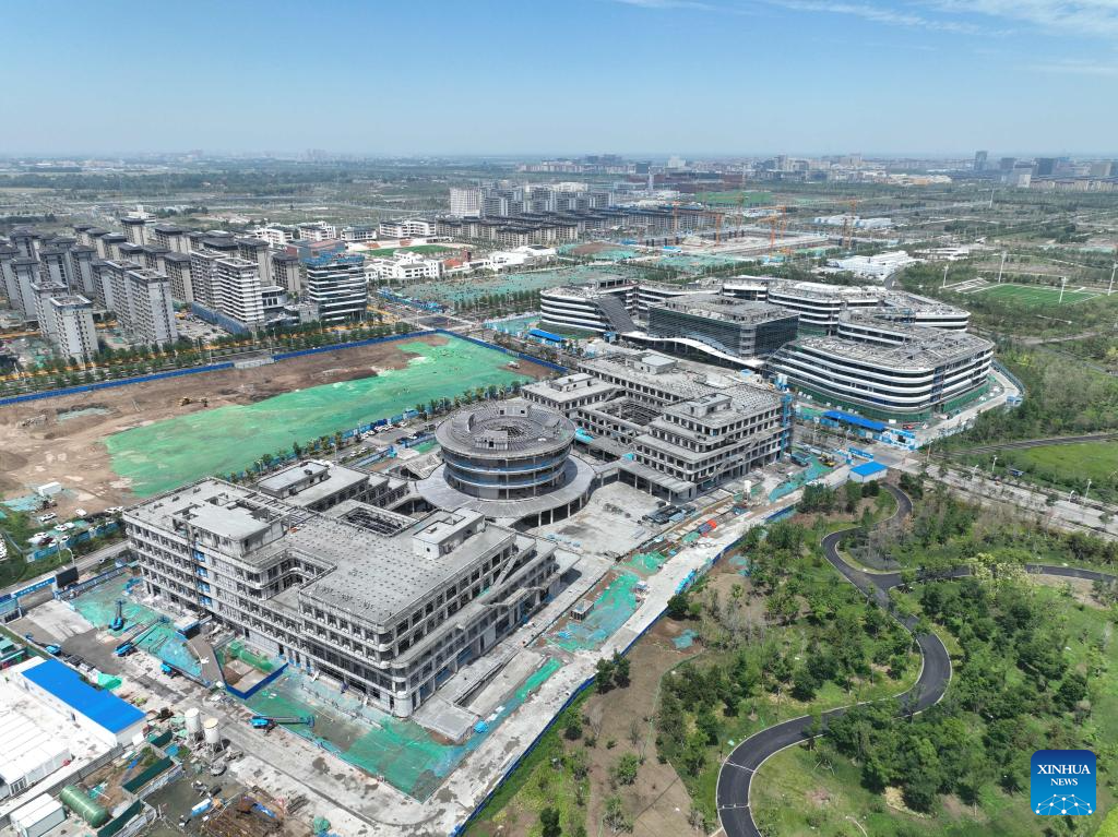 This aerial photo taken on July 4, 2023 shows the construction site of the China Mobile Xiong'an smart city science and innovation center at an internet industrial park in the start-up area in Xiong'an New Area, north China's Hebei Province. China announced plans to establish the Xiong'an New Area on April 1, 2017, located about 100 km southwest of Beijing, aiming to build the area into a national model of high-quality development and a new engine for the modern economic system.