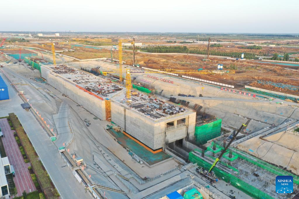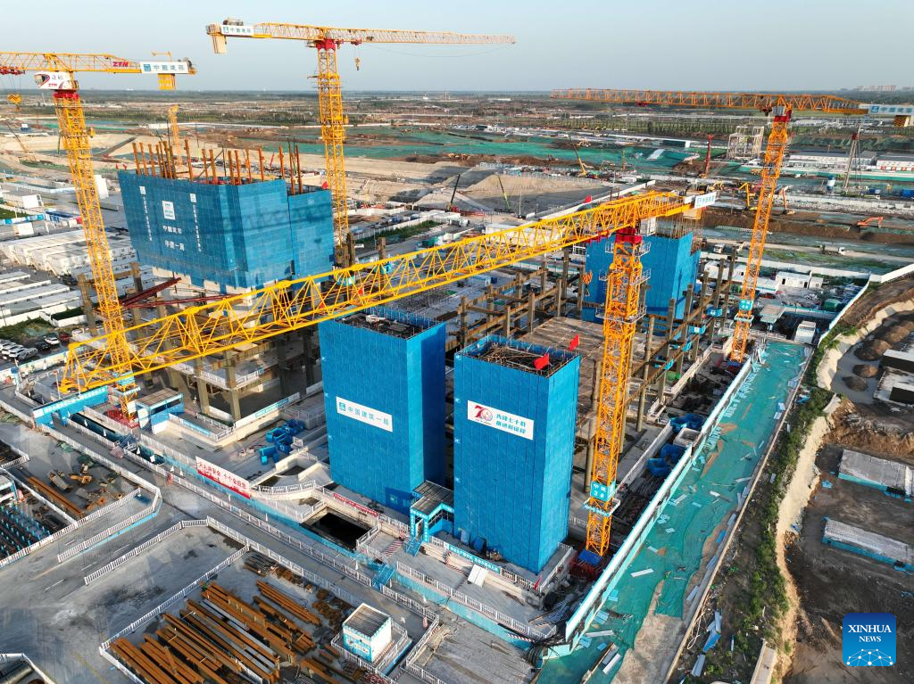 This aerial photo taken on July 4, 2023 shows the construction site of the financial island station on an express line linking Xiong'an with Beijing Daxing International Airport (R1 line) in the start-up area in Xiong'an New Area, north China's Hebei Province. China announced plans to establish the Xiong'an New Area on April 1, 2017, located about 100 km southwest of Beijing, aiming to build the area into a national model of high-quality development and a new engine for the modern economic system.