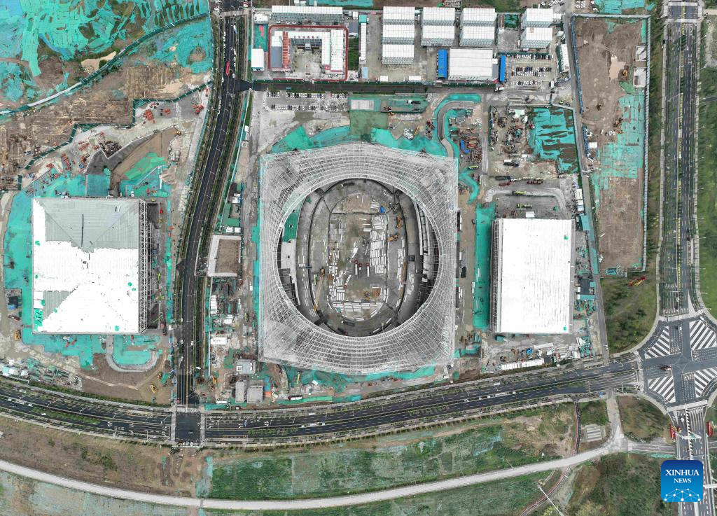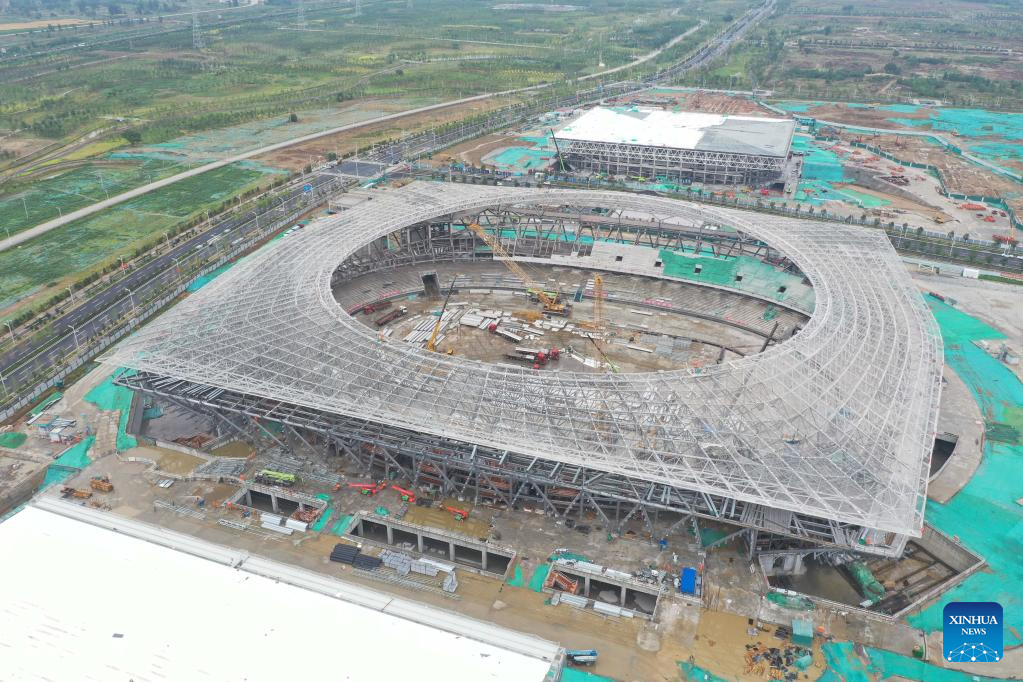 This aerial photo taken on July 4, 2023 shows the construction site of Xiong'an sports center in the start-up area in Xiong'an New Area, north China's Hebei Province. China announced plans to establish the Xiong'an New Area on April 1, 2017, located about 100 km southwest of Beijing, aiming to build the area into a national model of high-quality development and a new engine for the modern economic system.