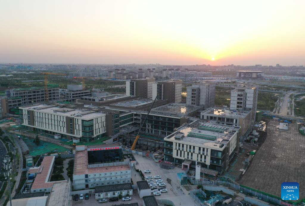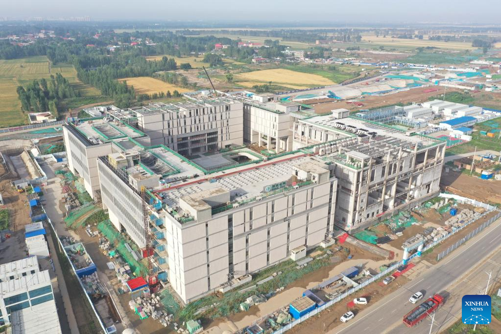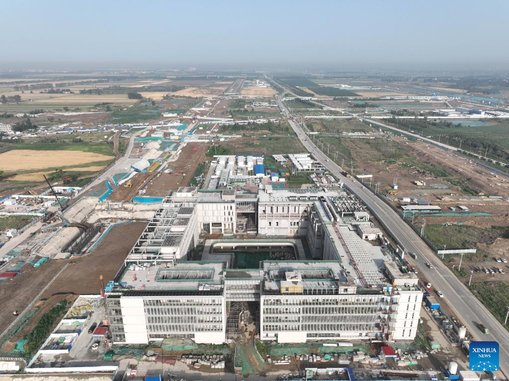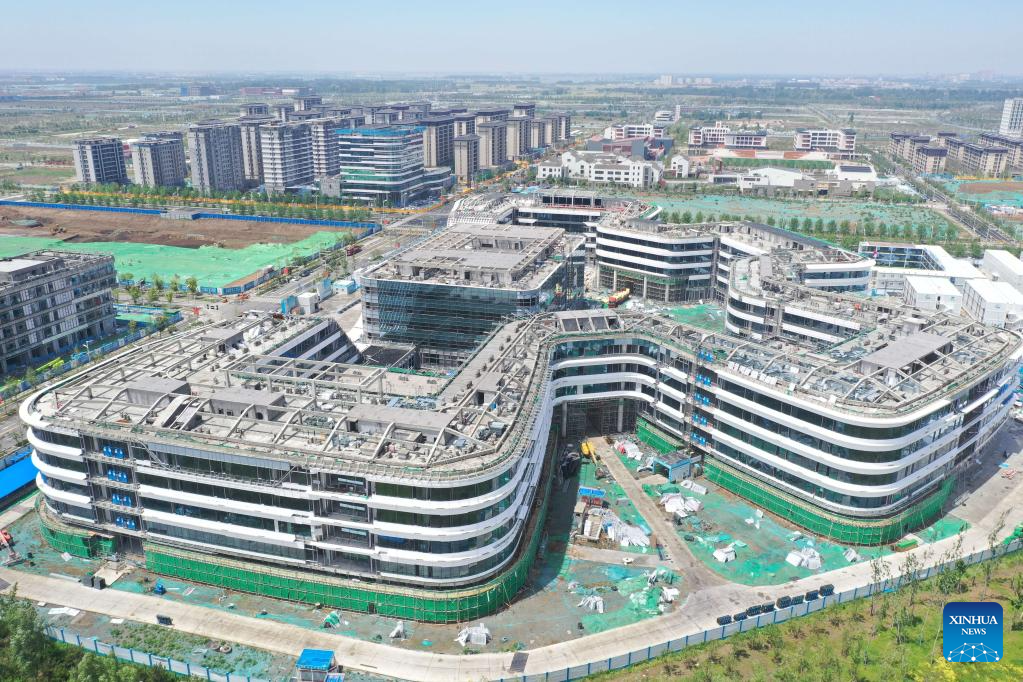 This aerial photo taken on July 4, 2023 shows the construction site of the Xiong'an branch of Beijing-based Xuanwu Hospital of the Capital Medical University in the start-up area in Xiong'an New Area, north China's Hebei Province. China announced plans to establish the Xiong'an New Area on April 1, 2017, located about 100 km southwest of Beijing, aiming to build the area into a national model of high-quality development and a new engine for the modern economic system.