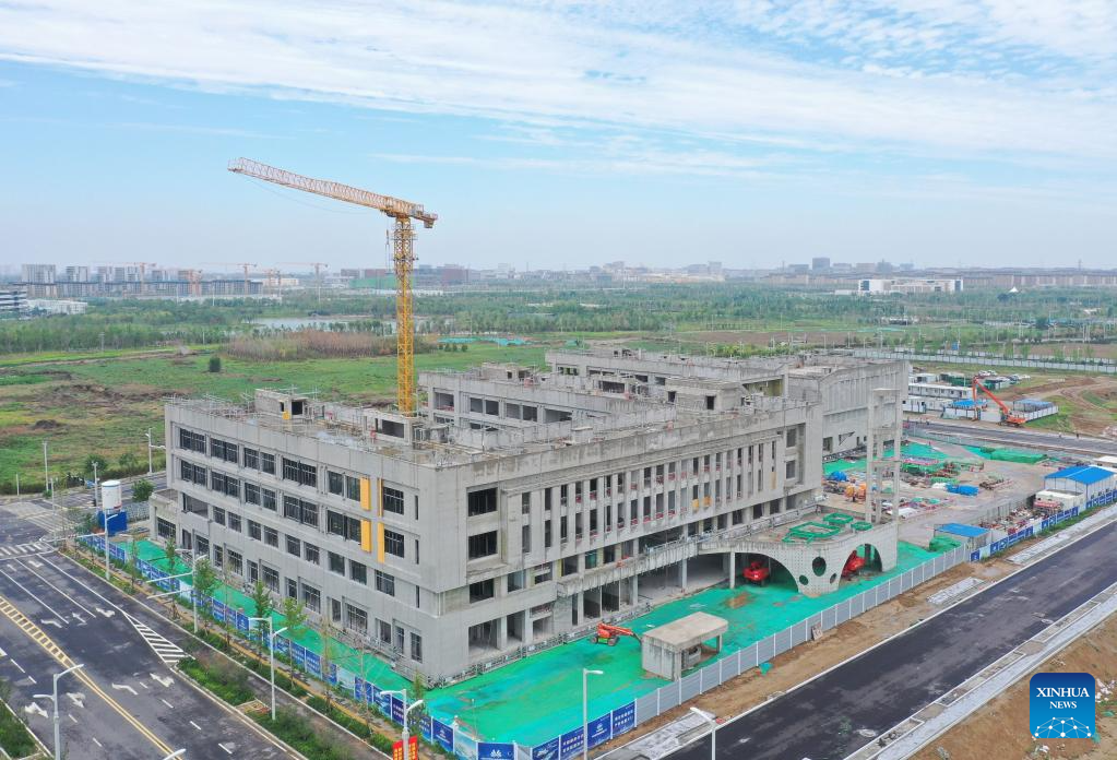 This aerial photo taken on July 4, 2023 shows the construction site of a library at the university zone in the start-up area in Xiong'an New Area, north China's Hebei Province. China announced plans to establish the Xiong'an New Area on April 1, 2017, located about 100 km southwest of Beijing, aiming to build the area into a national model of high-quality development and a new engine for the modern economic system.
