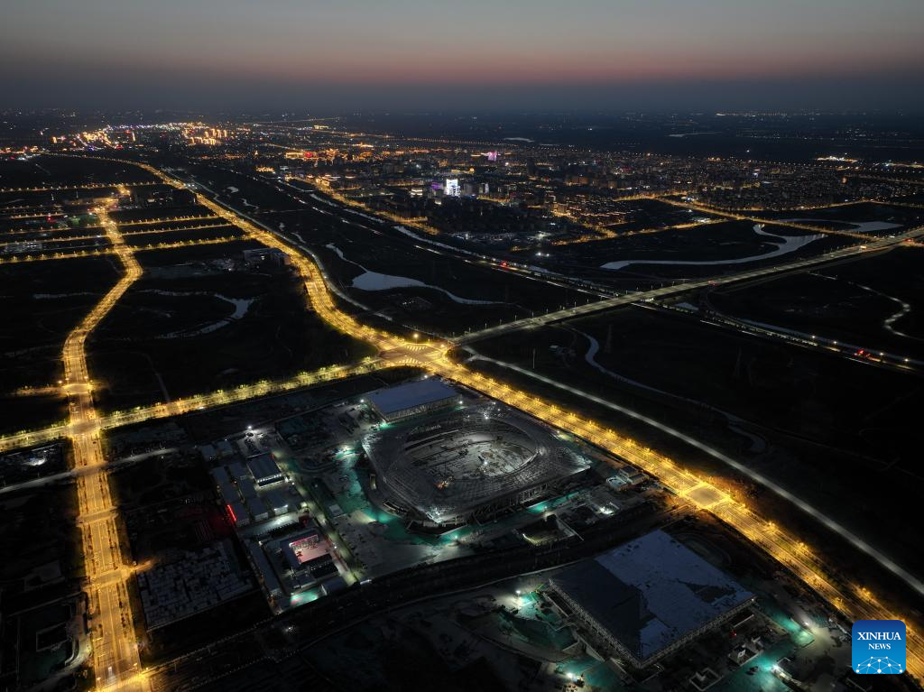 This aerial photo taken on July 4, 2023 shows a night view of Xiong'an sports center in the start-up area in Xiong'an New Area, north China's Hebei Province. China announced plans to establish the Xiong'an New Area on April 1, 2017, located about 100 km southwest of Beijing, aiming to build the area into a national model of high-quality development and a new engine for the modern economic system.