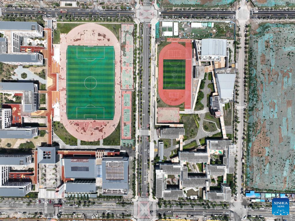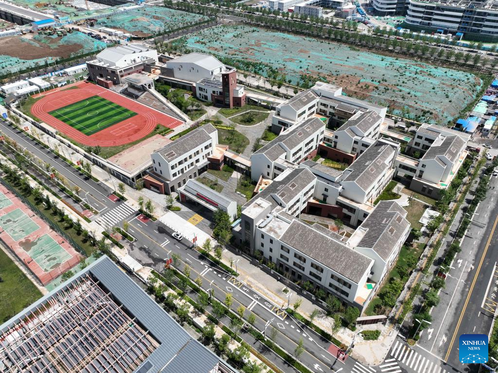 This aerial photo taken on July 4, 2023 shows a view of a branch of Beijing Shijia Primary School (R) and a branch of Beijing No. 4 High School in the start-up area in Xiong'an New Area, north China's Hebei Province. China announced plans to establish the Xiong'an New Area on April 1, 2017, located about 100 km southwest of Beijing, aiming to build the area into a national model of high-quality development and a new engine for the modern economic system.