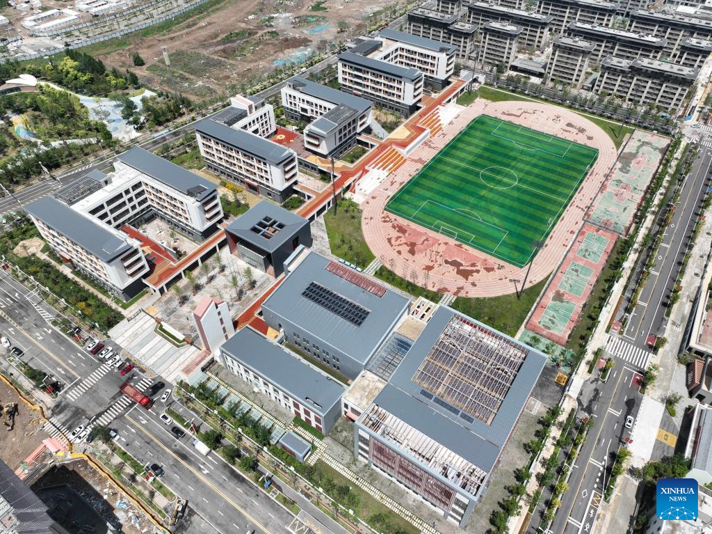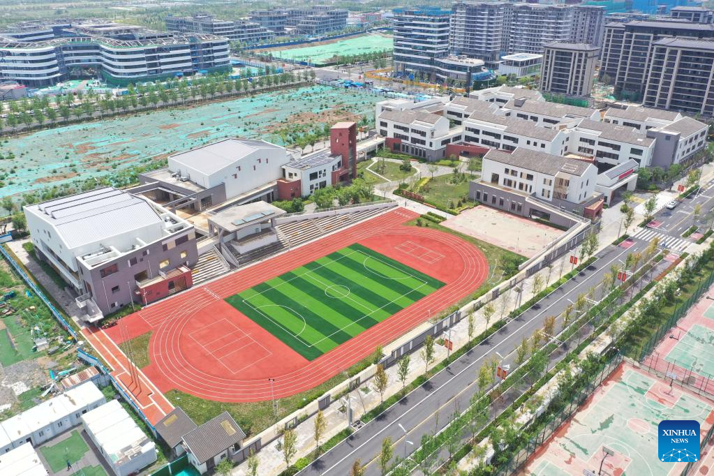 This aerial photo taken on July 4, 2023 shows a view of a branch of Beijing Shijia Primary School in the start-up area in Xiong'an New Area, north China's Hebei Province. China announced plans to establish the Xiong'an New Area on April 1, 2017, located about 100 km southwest of Beijing, aiming to build the area into a national model of high-quality development and a new engine for the modern economic system.