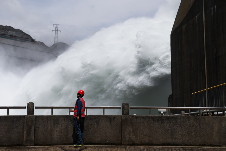 Photo taken on July 9, 2020 shows water gushing out from a gate of the Lijiaxia Hydropower Station at the border of Jainca County and Hualong County in northwest China's Qinghai Province. (Xinhua/Wu Gang)