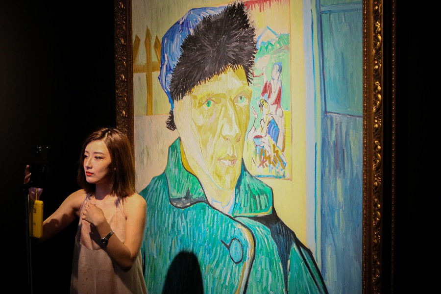 A visitor is seen during the immersive exhibition "Van Gogh Alive: the experience" at the World Expo Museum at night in Shanghai, east China, July 16, 2023. (Xinhua/Xin Mengchen)