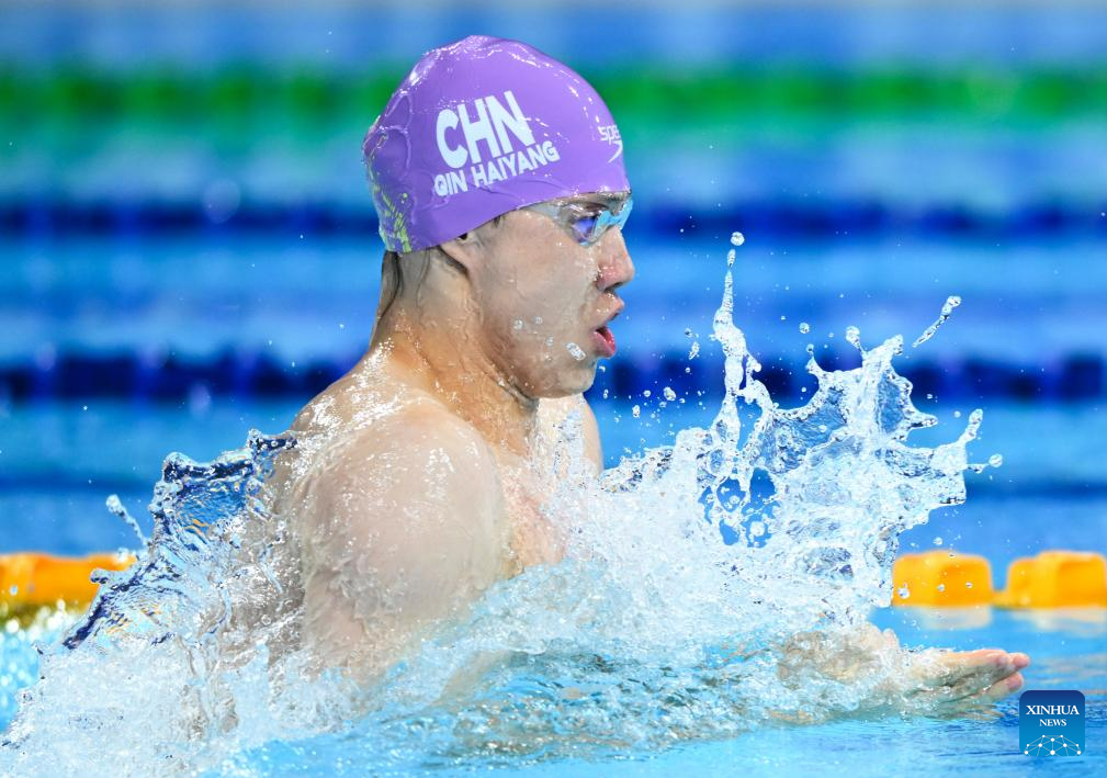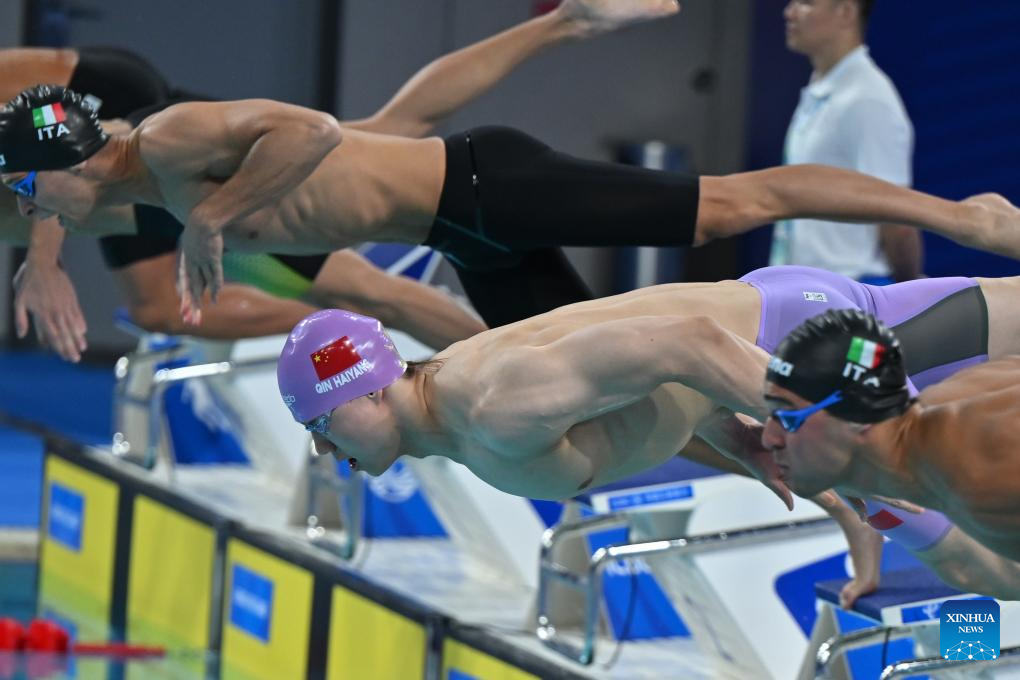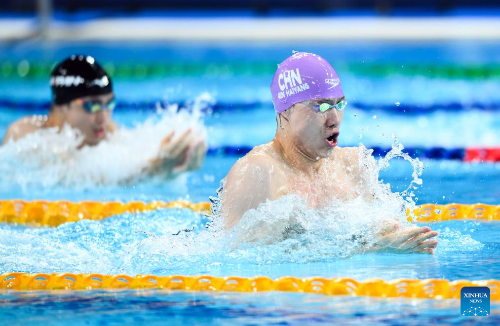 Qin Haiyang (C) of China competes during the Men's 100m Breaststroke Heats of swimming at the 31st FISU Summer World University Games in Chengdu, southwest China's Sichuan Province, Aug. 1, 2023. (Xinhua/Chen Zeguo)