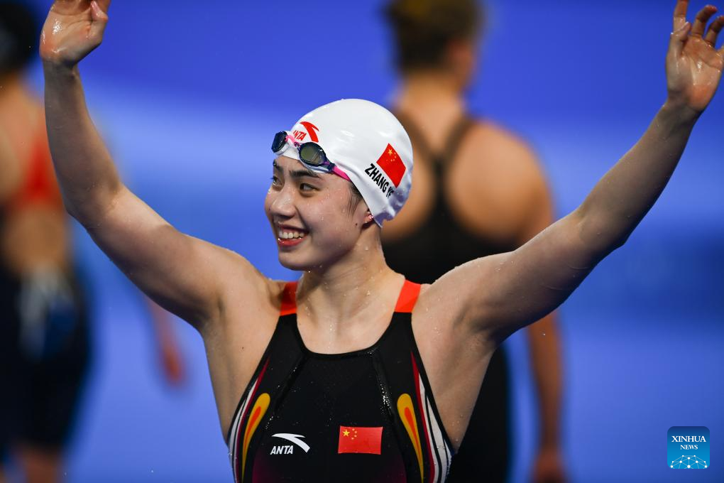 Zhang Yufei of China reacts after the Women's 50m Butterfly Heats of swimming at the 31st FISU Summer World University Games in Chengdu, southwest China's Sichuan Province, Aug. 1, 2023. (Xinhua/Chen Zeguo)