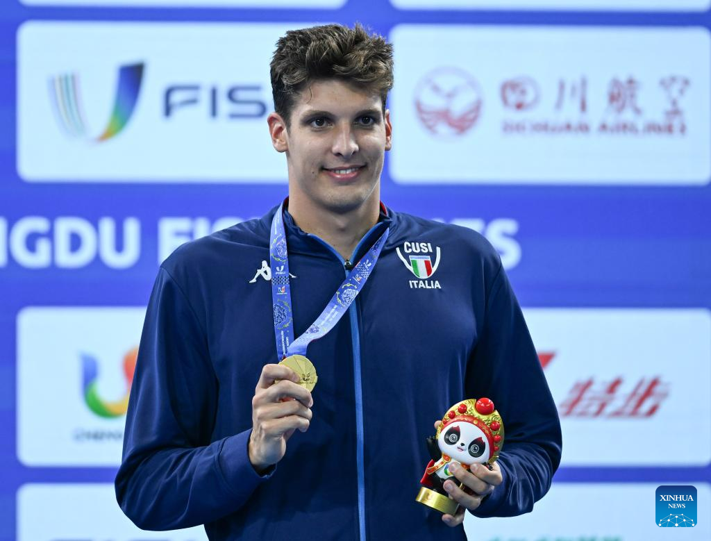 Gold medalist Matteo Lamberti of Italy celebrates during the awarding ceremony of the Men's 400m Freestyle of swimming at the 31st FISU Summer World University Games in Chengdu, southwest China's Sichuan Province, Aug. 1, 2023. (Xinhua/Zhang Long)