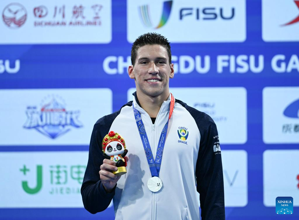 Silver medalist Eduardo Oliveira de Moraes of Brazil celebrates during the awarding ceremony of the Men's 400m Freestyle of swimming at the 31st FISU Summer World University Games in Chengdu, southwest China's Sichuan Province, Aug. 1, 2023. (Xinhua/Zhang Long)