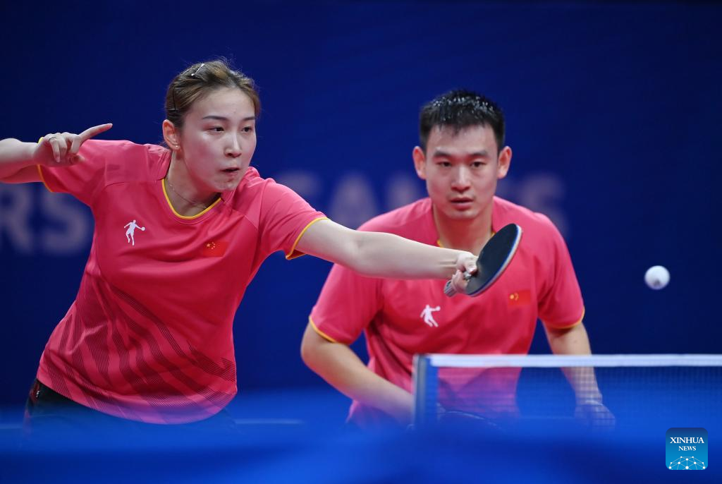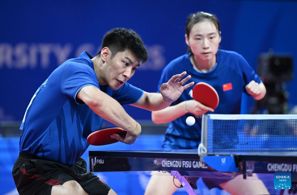 CHENGDU, Aug. 3 (Xinhua) -- Liu Dingshuo and Qian Tianyi of China beat their compatriots Xue Fei and Wang Xiaotong 4-1 to win the mixed doubles table tennis title at the World University Games here on Thursday.