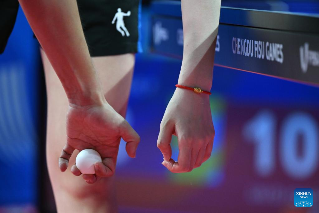 Xue Fei (L)/Wang Xiaotong of China compete during the table tennis mixed doubles final agaist Liu Dingshuo/Qian Tianyi of China at the 31st FISU Summer World University Games in Chengdu, southwest China's Sichuan Province, Aug. 3, 2023. (Xinhua/Zhao Zishuo)