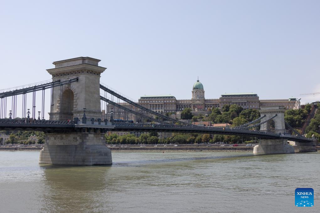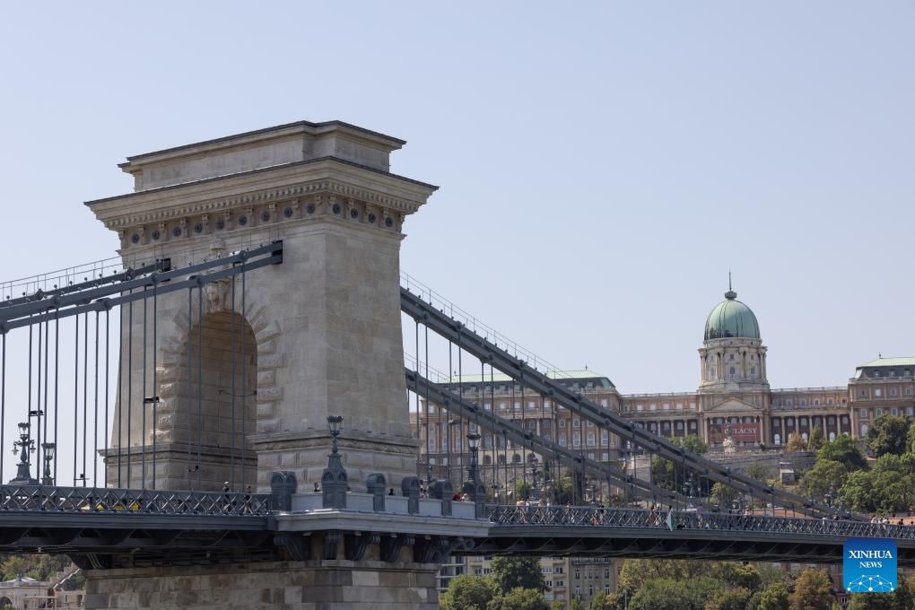 The Szechenyi Chain Bridge is seen in Budapest, Hungary on Aug. 4, 2023. In a momentous occasion marking the end of a comprehensive two-year renovation, Budapest's iconic Szechenyi Chain Bridge, the oldest permanent bridge in the city, has been fully reopened to the grand public on Friday. (Photo by Attila Volgyi/Xinhua)