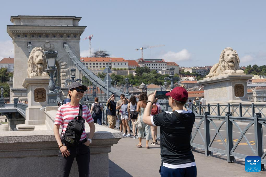 People take photos on the Szechenyi Chain Bridge in Budapest, Hungary on Aug. 4, 2023. In a momentous occasion marking the end of a comprehensive two-year renovation, Budapest's iconic Szechenyi Chain Bridge, the oldest permanent bridge in the city, has been fully reopened to the grand public on Friday. (Photo by Attila Volgyi/Xinhua)