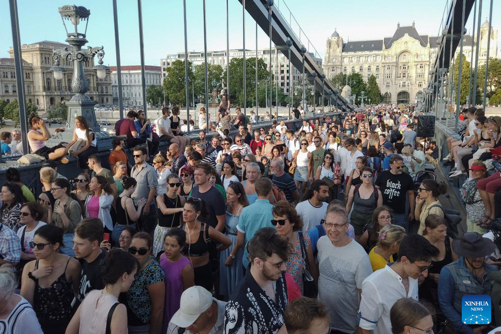 People celebrate on the Szechenyi Chain Bridge in Budapest, Hungary on Aug. 4, 2023. In a momentous occasion marking the end of a comprehensive two-year renovation, Budapest's iconic Szechenyi Chain Bridge, the oldest permanent bridge in the city, has been fully reopened to the grand public on Friday. (Photo by Attila Volgyi/Xinhua)
