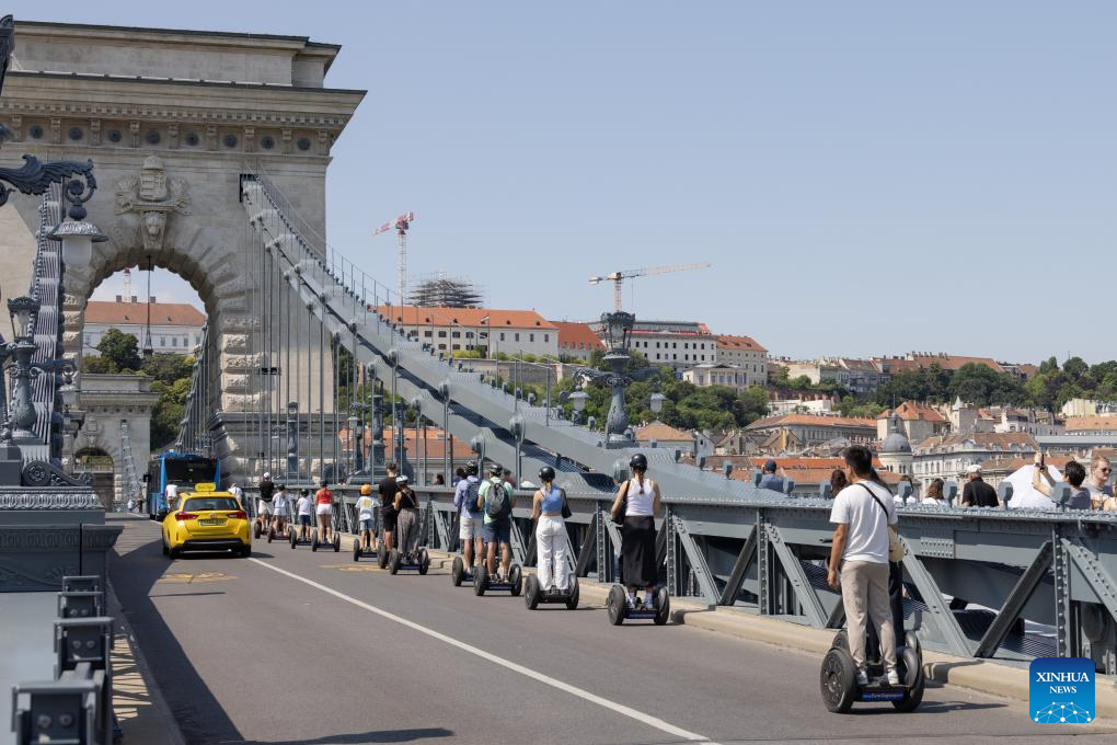 Tourists on segways cross the Szechenyi Chain Bridge in Budapest, Hungary on Aug. 4, 2023. In a momentous occasion marking the end of a comprehensive two-year renovation, Budapest's iconic Szechenyi Chain Bridge, the oldest permanent bridge in the city, has been fully reopened to the grand public on Friday. (Photo by Attila Volgyi/Xinhua)