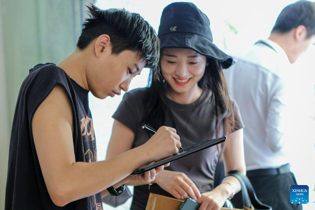 Manager Xiaoyu (R) communicates with a customer through written words at Dugout Coffee & Brunch in east China's Shanghai, Aug. 10, 2023. All the seven employees of Dugout Coffee & Brunch are hearing-impaired people. The owner of the coffee hopes to pass on the positive attitude of the employees to more people. (Photo by Li Xinyi/Xinhua)
