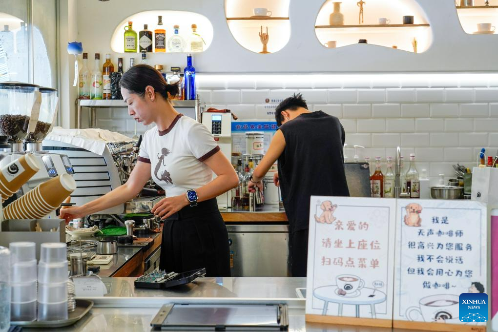 Staff members work at Dugout Coffee & Brunch in east China's Shanghai, Aug. 10, 2023. All the seven employees of Dugout Coffee & Brunch are hearing-impaired people. The owner of the coffee hopes to pass on the positive attitude of the employees to more people. (Photo by Li Xinyi/Xinhua)