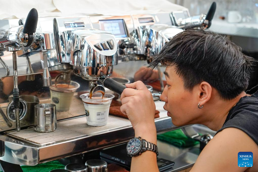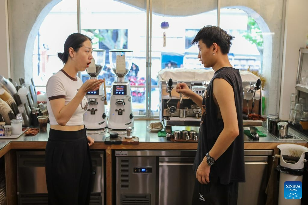 Manager Xiaoyu makes coffee at Dugout Coffee & Brunch in east China's Shanghai, Aug. 10, 2023. All the seven employees of Dugout Coffee & Brunch are hearing-impaired people. The owner of the coffee hopes to pass on the positive attitude of the employees to more people. (Photo by Li Xinyi/Xinhua)