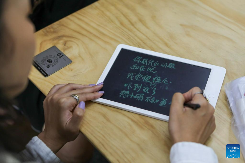 Owner Ni Rui communicates with a staff member through written words at Dugout Coffee & Brunch in east China's Shanghai, Aug. 10, 2023. All the seven employees of Dugout Coffee & Brunch are hearing-impaired people. The owner of the coffee hopes to pass on the positive attitude of the employees to more people. (Xinhua/Xin Mengchen)