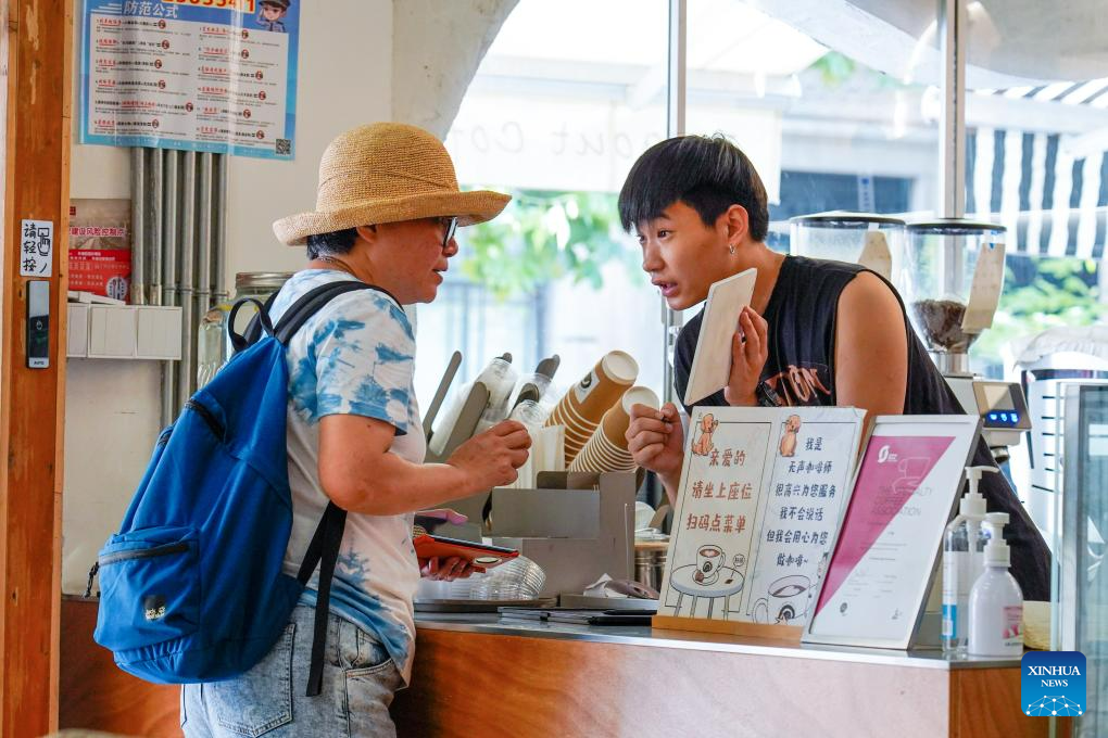 Manager Xiaoyu (L) takes order for a customer at Dugout Coffee & Brunch in east China's Shanghai, Aug. 10, 2023. All the seven employees of Dugout Coffee & Brunch are hearing-impaired people. The owner of the coffee hopes to pass on the positive attitude of the employees to more people. (Xinhua/Xin Mengchen)
