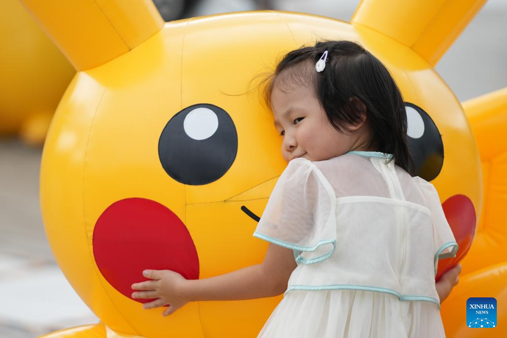 A girl hugs an inflatable Pikachu at Minatomirai in Yokohama, Japan, Aug. 13, 2023. To commemorate the launch of the 2023 Pokemon World Championships, a Pokemon festival is held in Yokohama's Minatomirai from Aug.11 to Aug.14. (Xinhua/Zhang Xiaoyu)