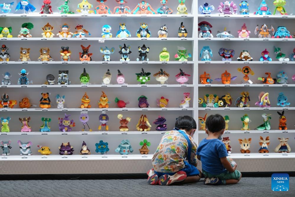 Kids play beside a display shelf at a Pokemon store of Minatomirai in Yokohama, Japan, Aug. 13, 2023. To commemorate the launch of the 2023 Pokemon World Championships, a Pokemon festival is held in Yokohama's Minatomirai from Aug.11 to Aug.14. (Xinhua/Zhang Xiaoyu)