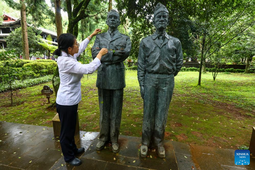 A worker removes fallen leaves from the statues of late U.S. generals Joseph Stilwell (L) and Claire Lee Chennault (R) at a cemetery in Tengchong, southwest China's Yunnan Province, Aug. 31, 2023.