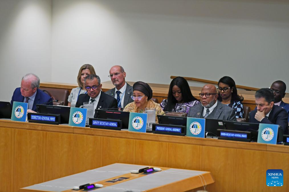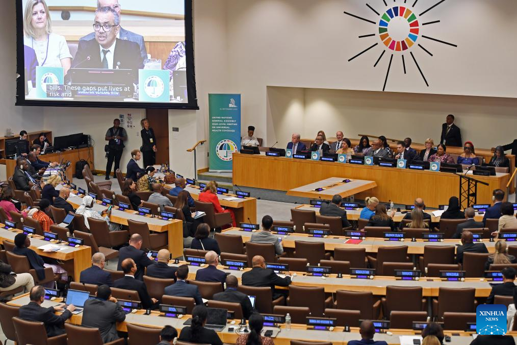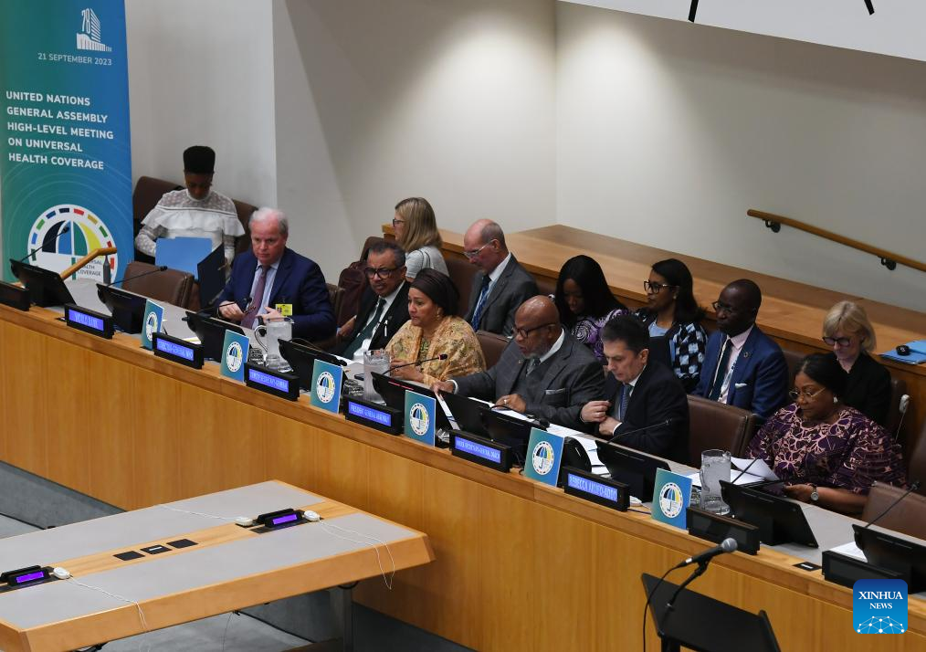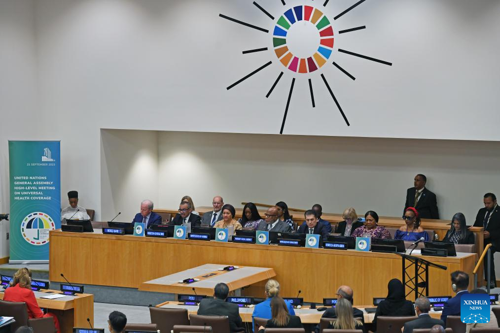 The High-Level Meeting on Universal Health Coverage is held at the UN headquarters in New York, on Sept. 21, 2023. World leaders on Thursday approved a new political declaration committing to redouble efforts toward universal health coverage by 2030. (Xinhua/Li Rui)