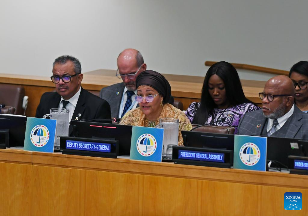 UN Deputy Secretary-General Amina Mohammed (C, Front) delivers a statement on behalf of the UN Secretary-General Antonio Guterres at the opening of the High-Level Meeting on Universal Health Coverage at the UN headquarters in New York, on Sept. 21, 2023. UN Secretary-General Antonio Guterres on Thursday emphasized the need for collective action to translate the life-saving concept of universal health coverage into a tangible reality for all people. (Xinhua/Li Rui)