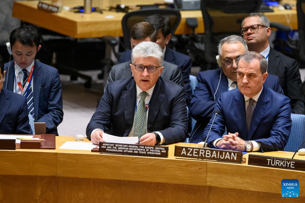 Miroslav Jenca (C), UN assistant secretary-general for Europe, Central Asia and the Americas, speaks at a Security Council meeting at UN Headquarters in New York on Sept. 21, 2023. The United Nations on Thursday called for a durable cessation of hostilities between Azerbaijan and Armenia following the latest escalation in the disputed Nagorno-Karabakh region. (Loey Felipe/UN Photo/Handout via Xinhua)