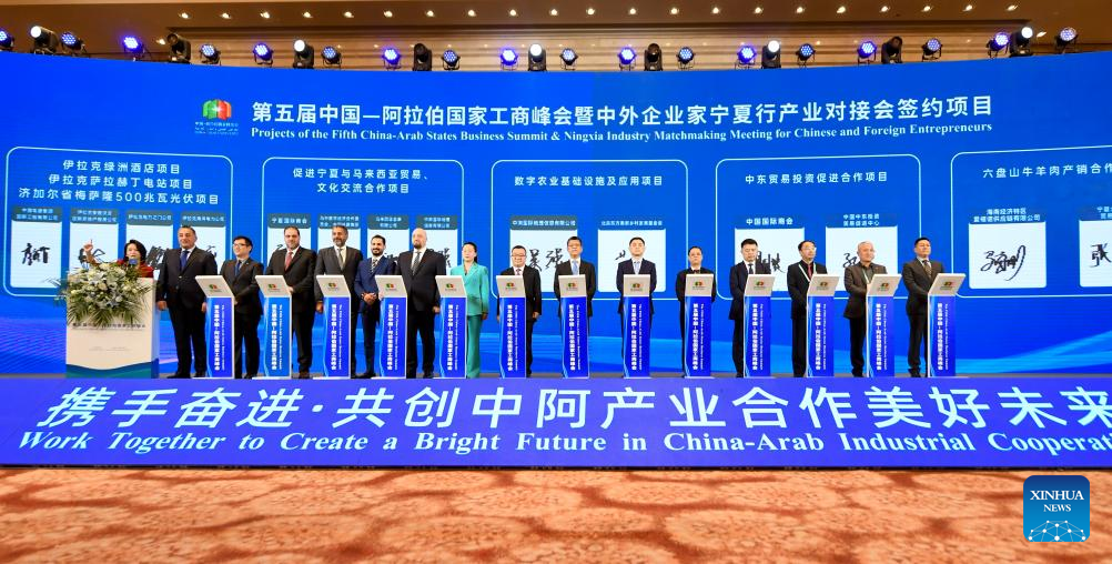 This photo taken on Sept. 21, 2023 shows the signing ceremony of the Projects of the Fifth China-Arab States Business Summit and Ningxia Industry Matchmaking Meeting for Chinese and Foreign Entrepreneurs during the sixth China-Arab States Expo in Yinchuan, northwest China's Ningxia Hui Autonomous Region. The sixth China-Arab States Expo opened Thursday in Yinchuan, capital of northwest China's Ningxia Hui Autonomous Region.
