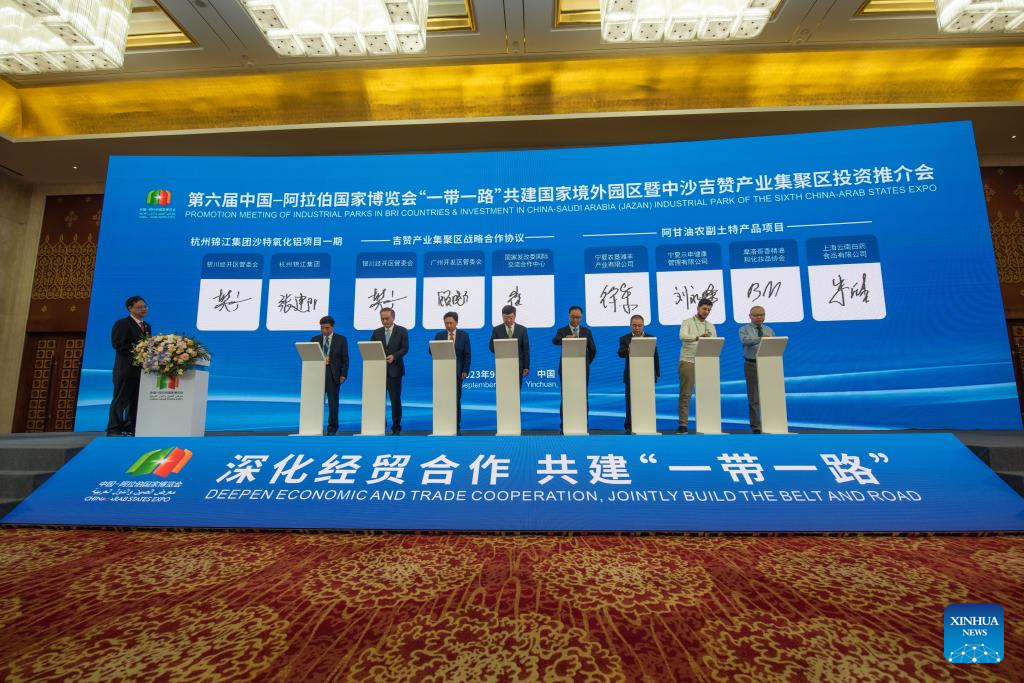 This photo taken on Sept. 22, 2023 shows the signing ceremony of the Promotion Meeting of Industrial Parks in BRI Countries and Investment in China-Saudi Arabia (Jazan) Industrial Park of the sixth China-Arab States Expo in Yinchuan, northwest China's Ningxia Hui Autonomous Region. The sixth China-Arab States Expo opened Thursday in Yinchuan, capital of northwest China's Ningxia Hui Autonomous Region.