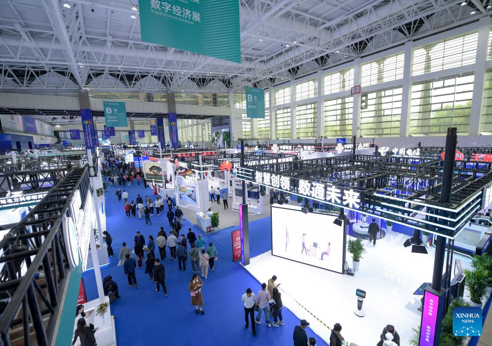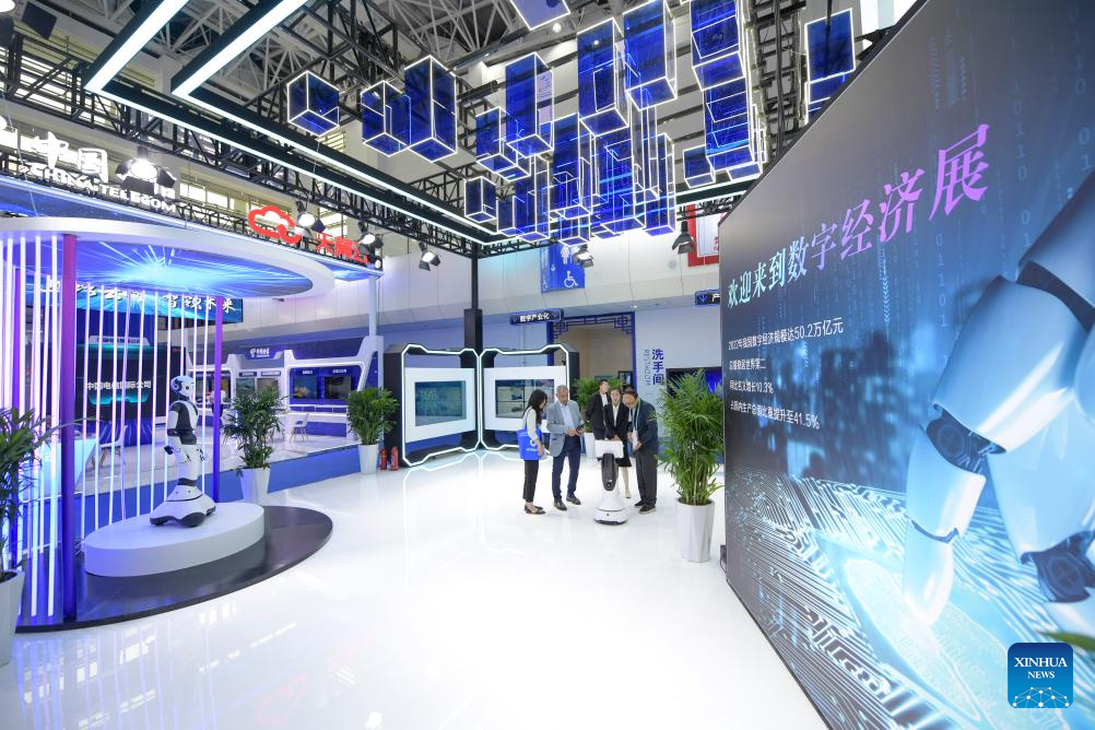 This photo taken on Sept. 22, 2023 shows the digital economy exhibition area at the sixth China-Arab States Expo in Yinchuan, northwest China's Ningxia Hui Autonomous Region. The sixth China-Arab States Expo opened Thursday in Yinchuan, capital of northwest China's Ningxia Hui Autonomous Region.