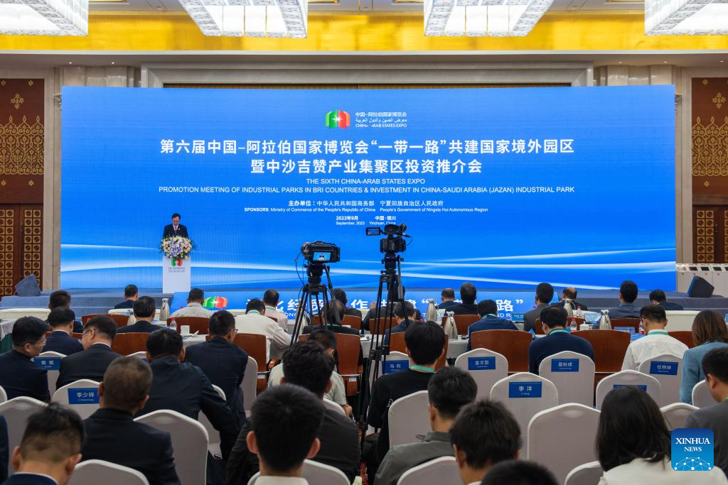 This photo taken on Sept. 22, 2023 shows a scene at the Promotion Meeting of Industrial Parks in BRI Countries and Investment in China-Saudi Arabia (Jazan) Industrial Park during the sixth China-Arab States Expo in Yinchuan, northwest China's Ningxia Hui Autonomous Region. The sixth China-Arab States Expo opened Thursday in Yinchuan, capital of northwest China's Ningxia Hui Autonomous Region.