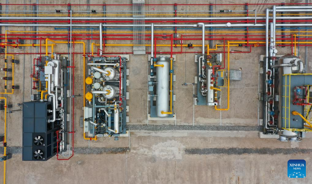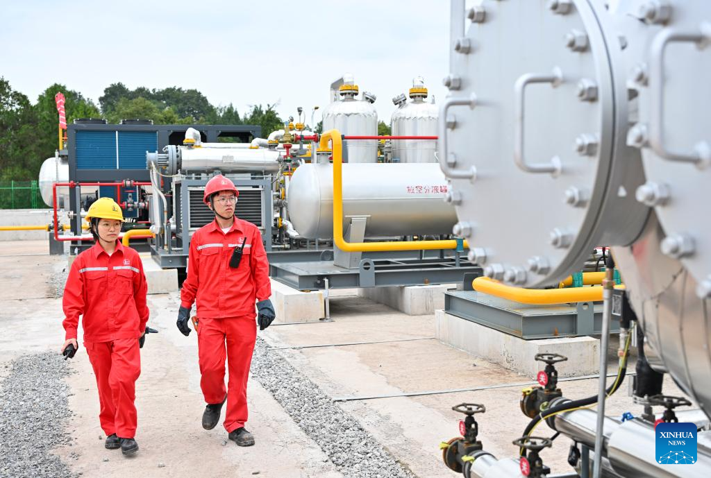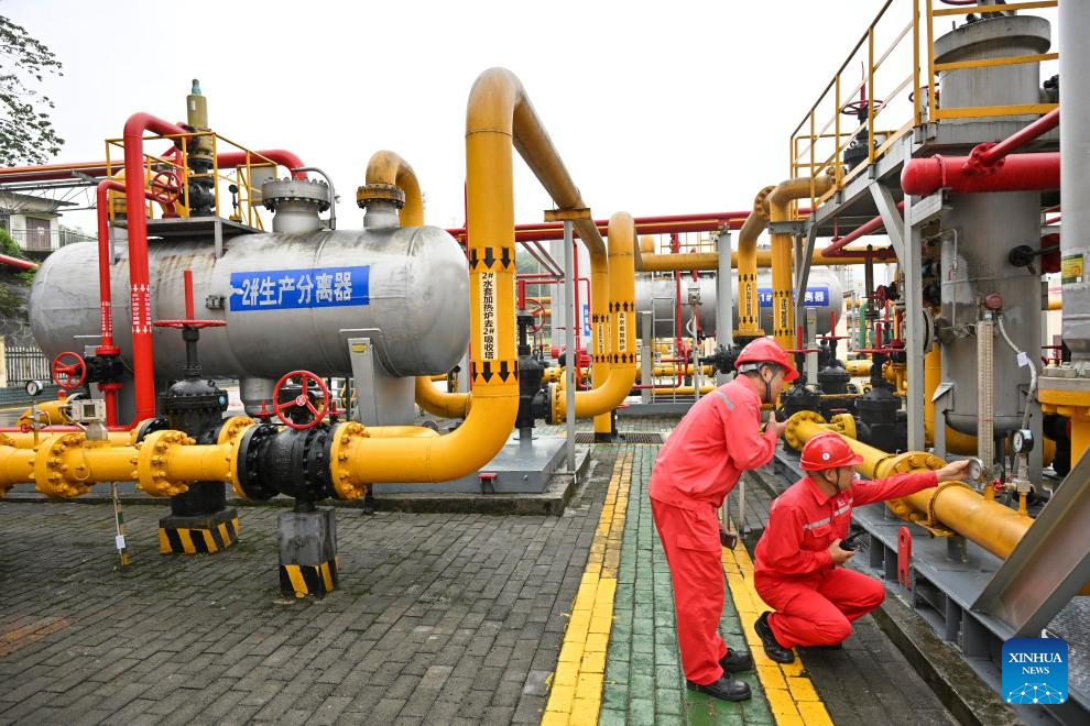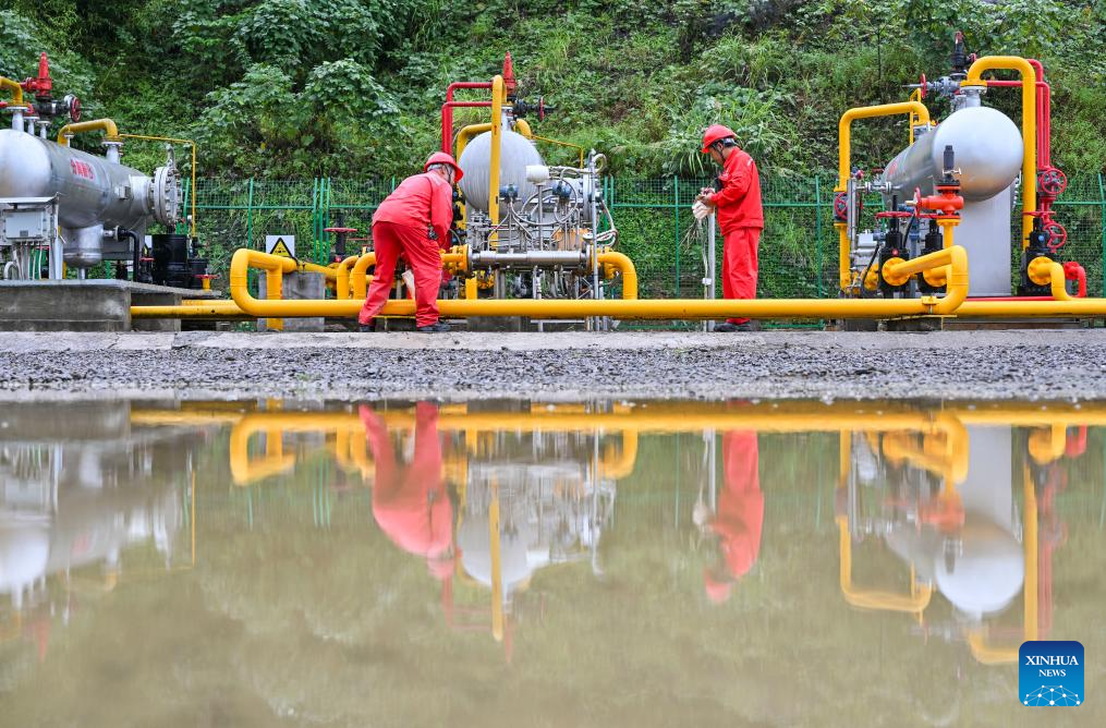 Technicians carry out routine maintenance at a gas gathering station of the Fuling shale gas field in Fuling, southwest China's Chongqing, Sept. 21, 2023.