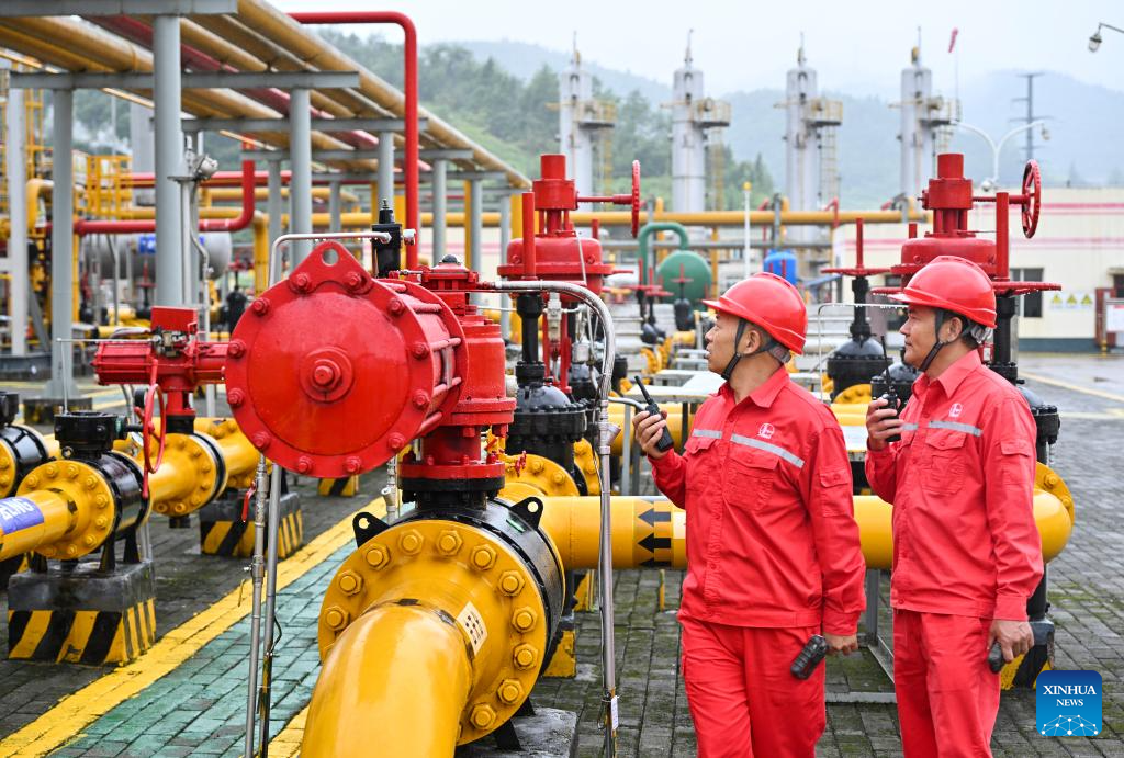 Technicians check equipment at a gas gathering and transmission station of the Fuling shale gas field in Fuling, southwest China's Chongqing, Sept. 21, 2023.