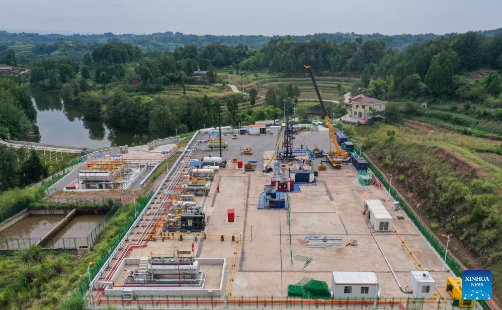 This aerial photo taken on Sept. 19, 2023 shows workers carrying out production activities at a well of the Fuling shale gas field in Zhongxian County, southwest China's Chongqing.