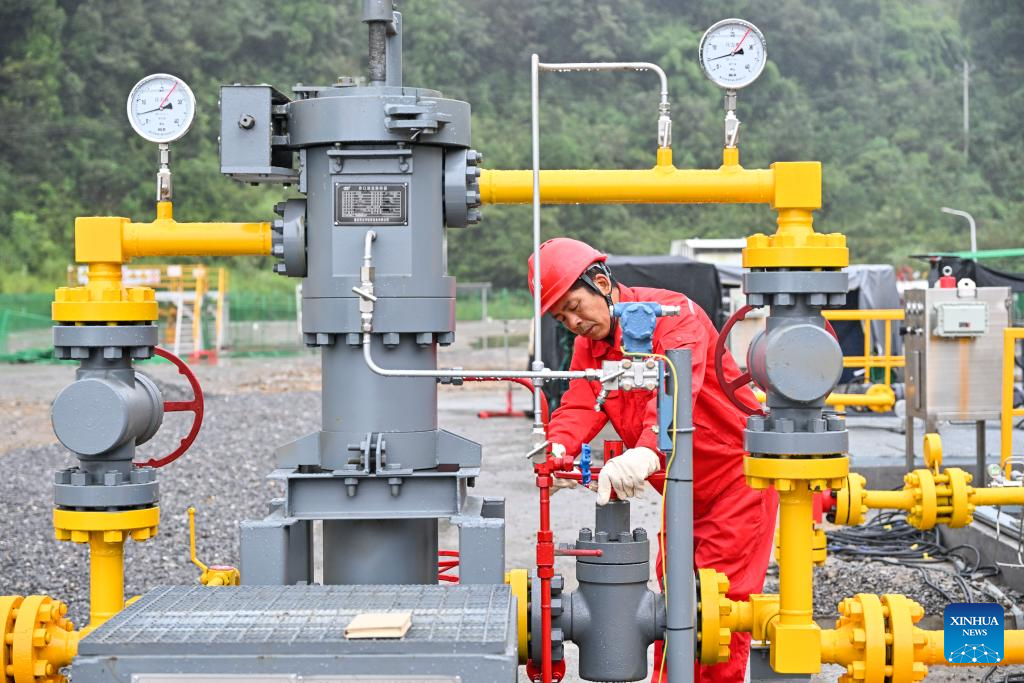 A technician carries out equipment maintenance at a well of the Fuling shale gas field in Zhongxian County, southwest China's Chongqing, Sept. 19, 2023.