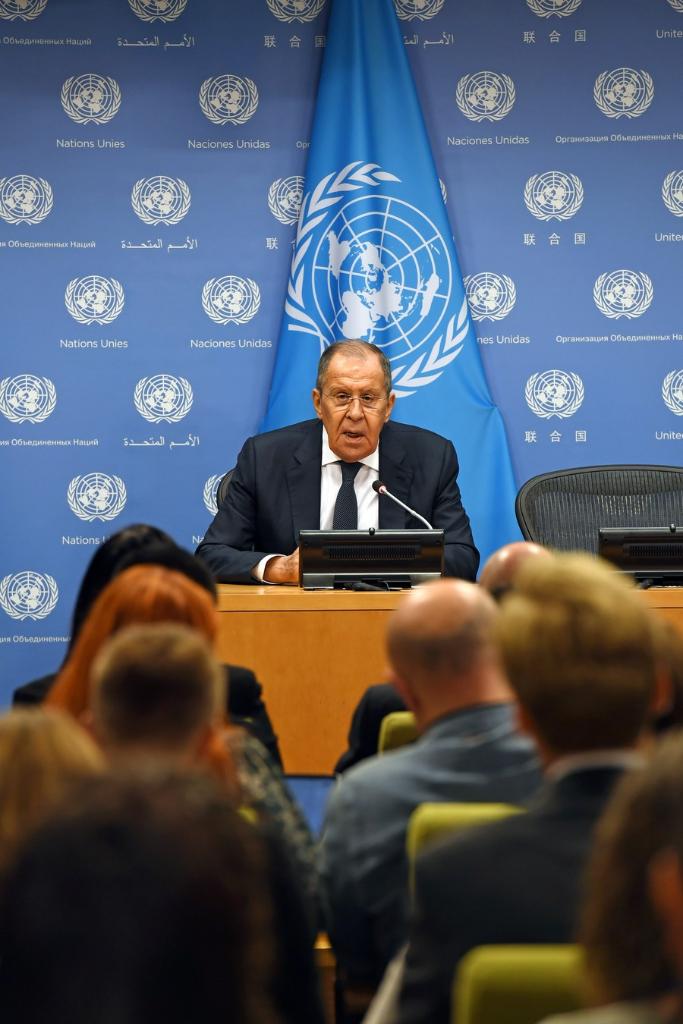 Russian Foreign Minister Sergei Lavrov speaks at a press conference at the UN headquarters in New York, on Sept. 23, 2023. (Xinhua/Li Rui)