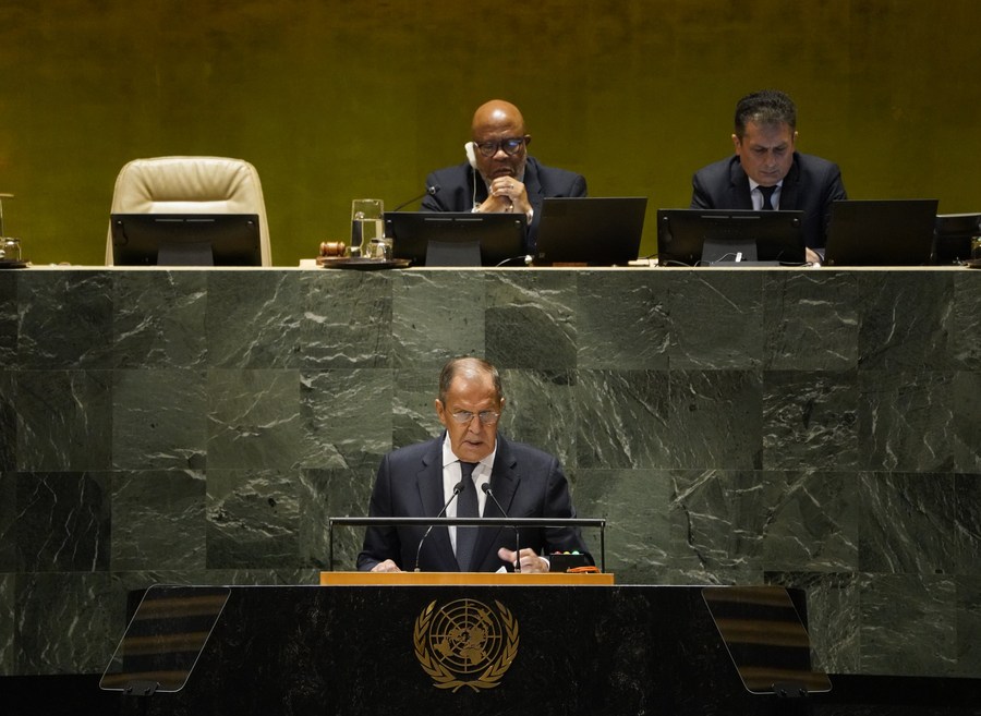 Russian Foreign Minister Sergei Lavrov delivers a speech at the General Debate of the 78th session of the UN General Assembly at the UN headquarters in New York, Sept. 23, 2023. (Xinhua/Wu Xiaoling)