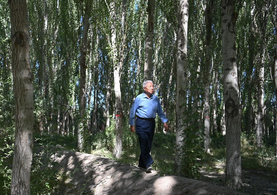 Imam Memet, the first head of the Kekeya forestry station, strolls through the lush woods that he has nurtured over the span of several decades in Aksu Prefecture, northwest China's Xinjiang Uygur Autonomous Region, Aug. 30, 2023. (Xinhua/Li Xiang)