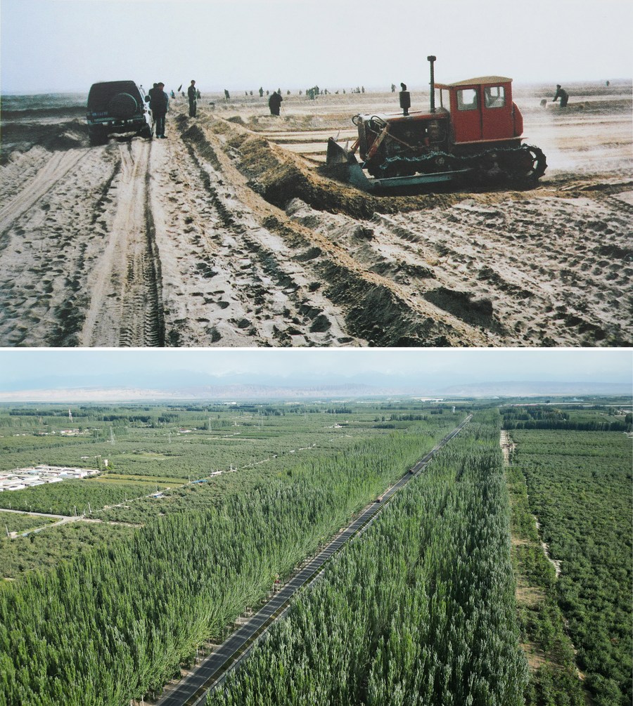 Before the founding of the People's Republic of China in 1949, local residents made sporadic efforts to plant trees, but few survived. During the 1960s, a project aimed at channeling water from a river in the city of Aksu was also forsaken.