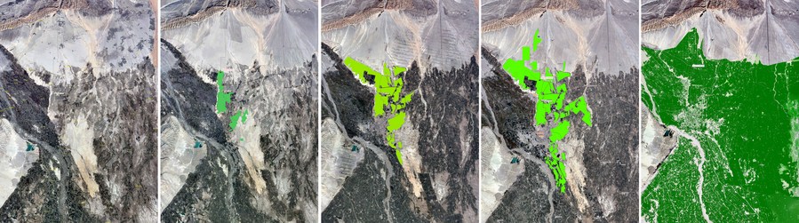 This series of satellite remote sensing images (from L to R) shows the vegetated areas in 1986,1996, 2006, 2012 and 2022, respectively, in Kekeya, Aksu Prefecture, northwest China's Xinjiang Uygur Autonomous Region. (Xinhua)