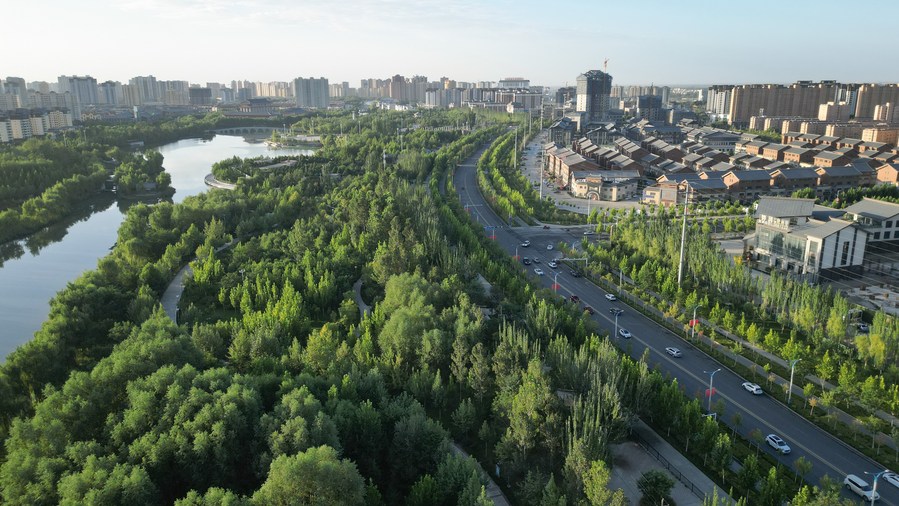 This aerial photo taken on Aug. 31, 2023 shows a view of urban area in Aksu Prefecture, northwest China's Xinjiang Uygur Autonomous Region. (Xinhua/Li Xiang)