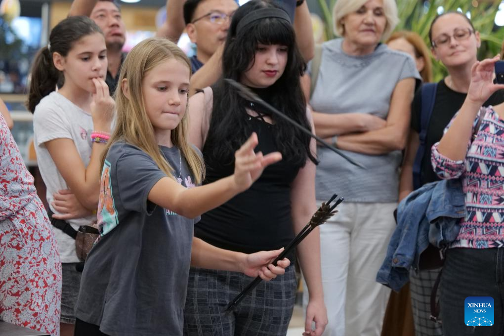 A Serbian girl plays Touhu game, or Pitch-pot, an ancient Chinese entertainment, during a Chinese culture event in the north-central Serbian city of Novi Sad, Sept. 23, 2023. This cultural event was hosted on Saturday by the Confucius Institute at the University of Novi Sad, attracting many local citizens. (Confucius Institute at the University of Novi Sad/Handout via Xinhua)