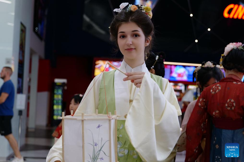 A Serbian student presents Hanfu costume during a Chinese culture event in the north-central Serbian city of Novi Sad, Sept. 23, 2023. This cultural event was hosted on Saturday by the Confucius Institute at the University of Novi Sad, attracting many local citizens. (Confucius Institute at the University of Novi Sad/Handout via Xinhua)