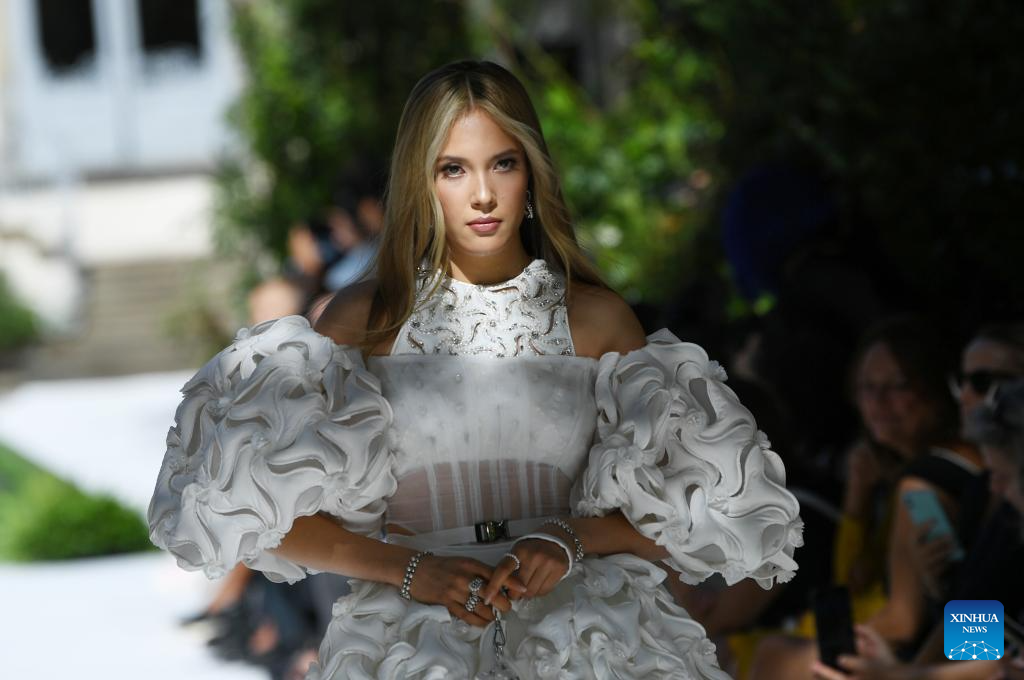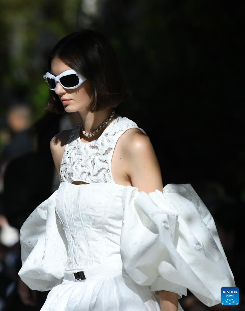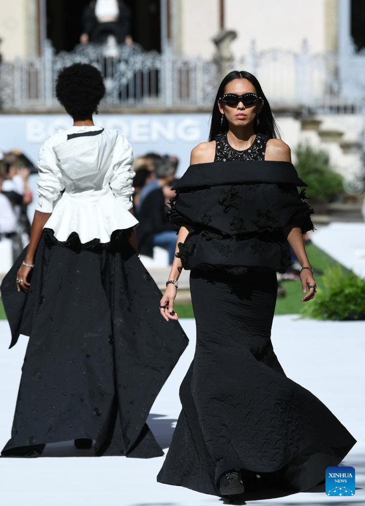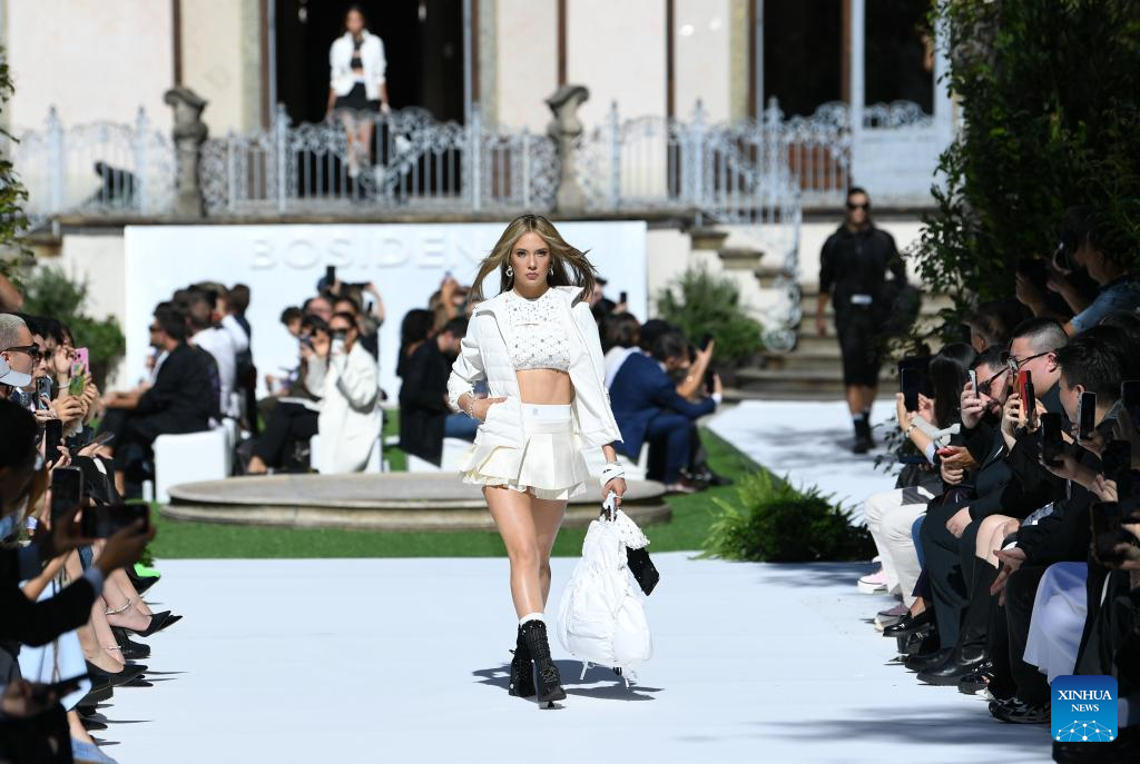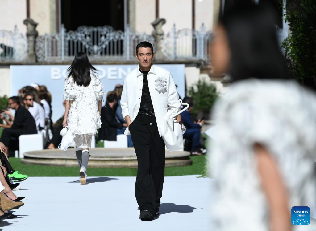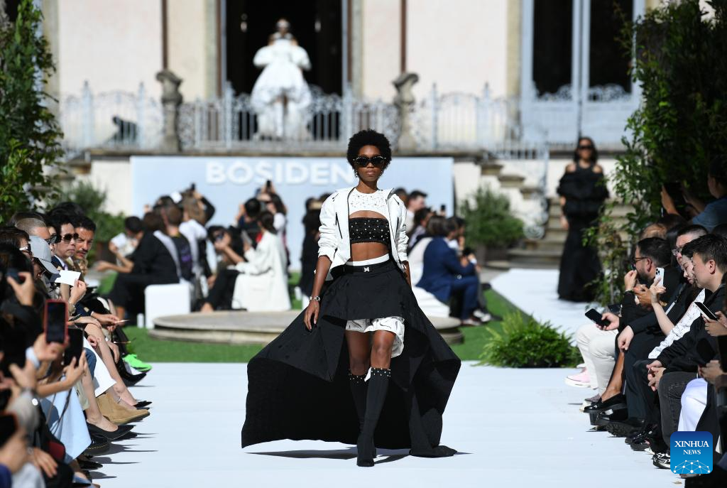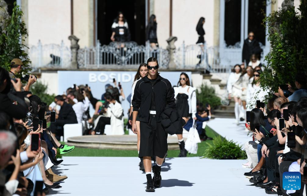 A model presents a creation from Bosideng's new collection during a fashion show in Milan, Italy, on Sept. 24, 2023. (Xinhua/Jin Mamengni)