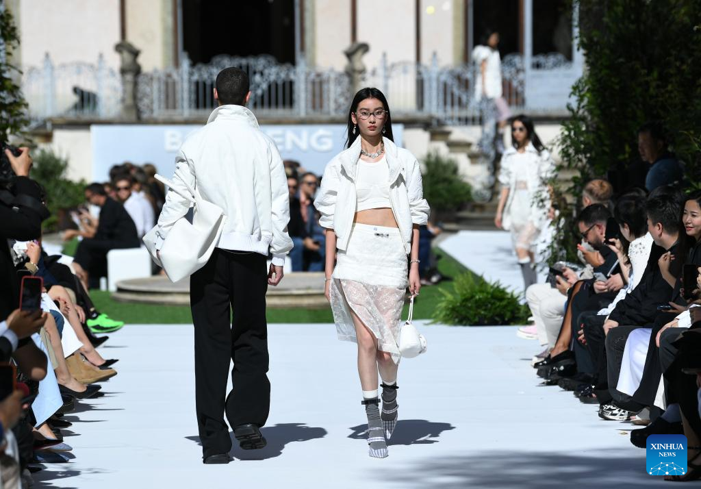 Models present creations from Bosideng's new collection during a fashion show in Milan, Italy, on Sept. 24, 2023. (Xinhua/Jin Mamengni)
