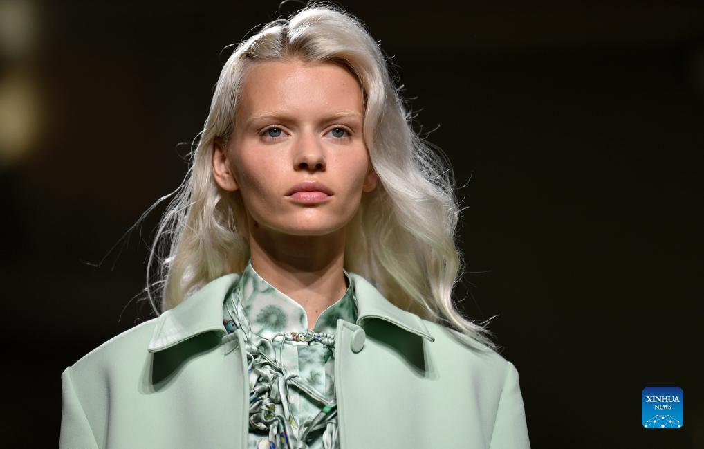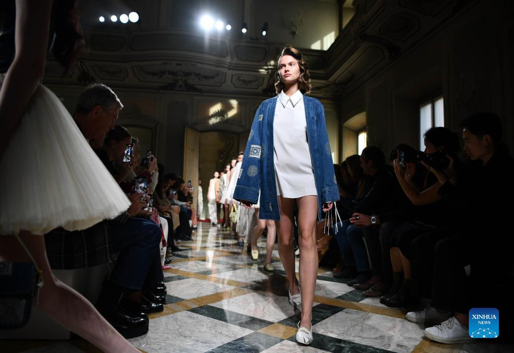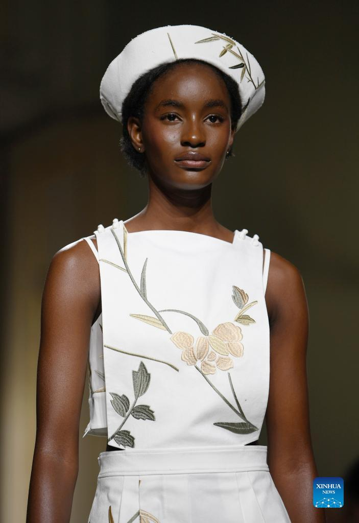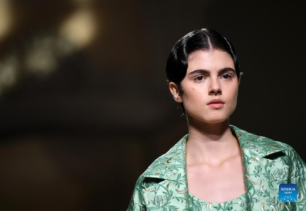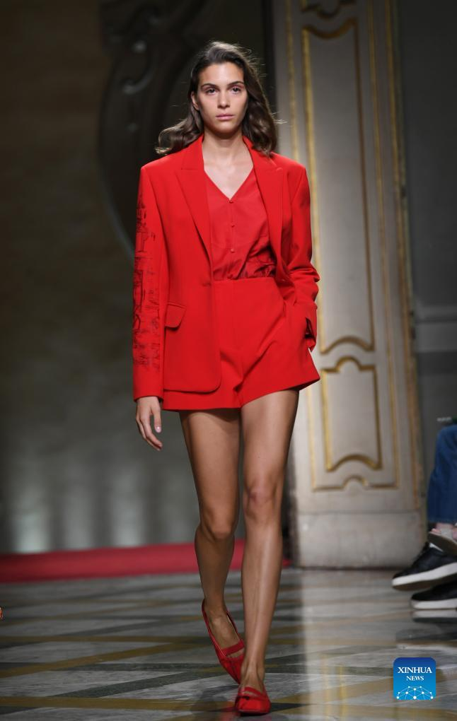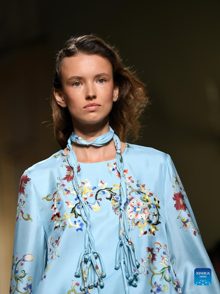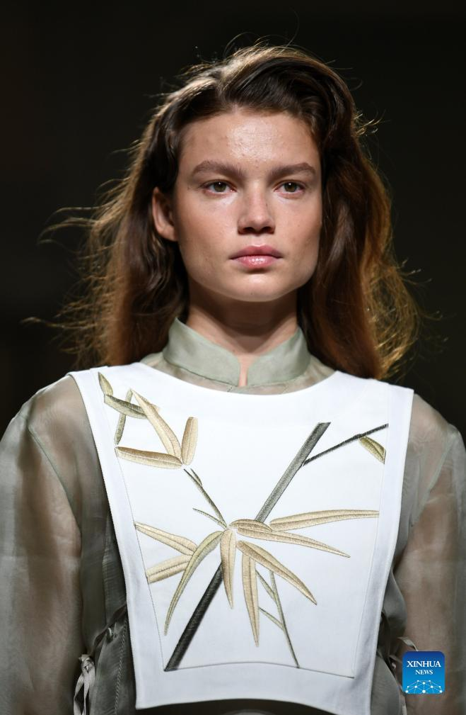 A model presents a creation featuring embroidery of Miao ethnic group from southwest China's Guizhou Province during Milan Fashion Week in Milan, Italy, Sept. 24, 2023. (Xinhua/Jin Mamengni)
